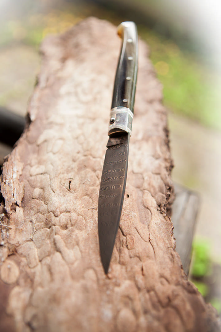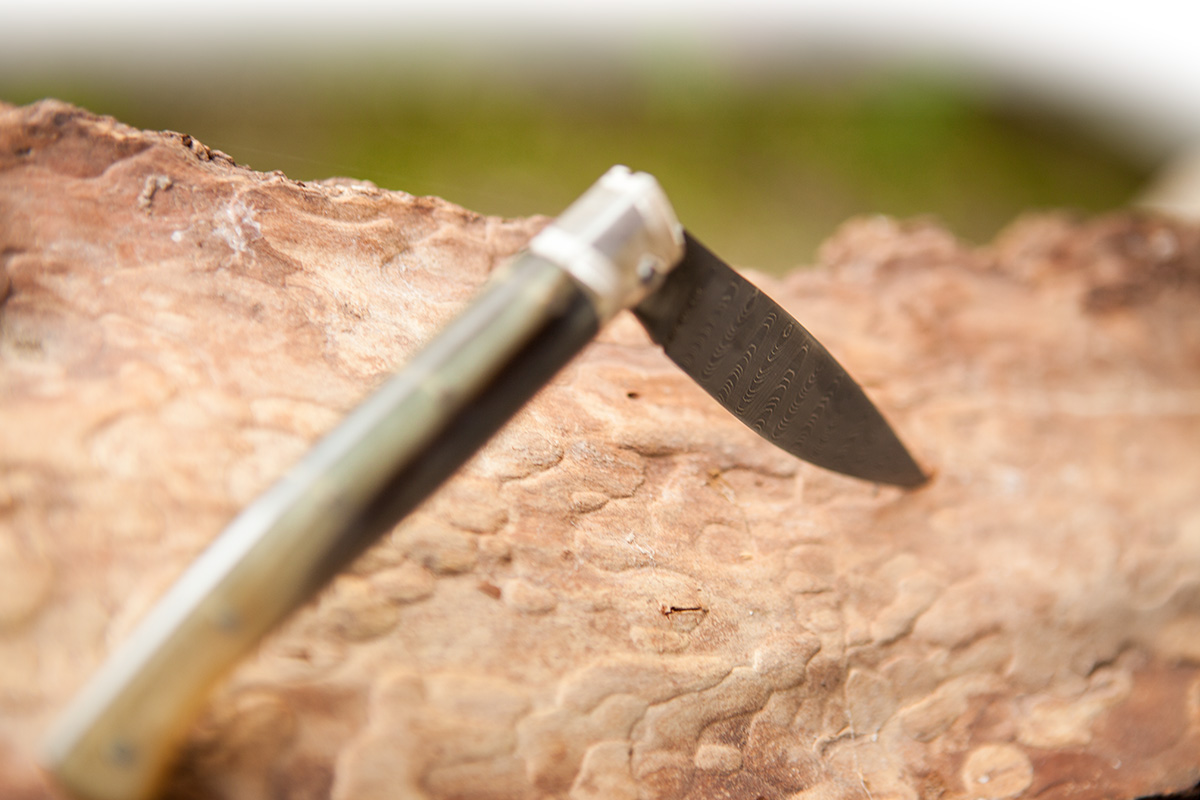 Hirtenmesser im Lederetui, Klinge aus DamaszenerstahlHandarbeit aus Santu Lussurgiu, SardinienKlingenlänge: 10 cm Griff: MufflonhornDie Farbe des Griffs kann vom Bild abweichen