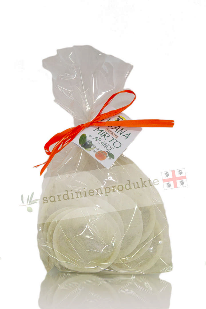 Eigenschaften: Die Myrtenbeere hat balsamische, entzündungshemmende, antioxidative, verdauungsfördernde und erfrischende Eigenschaften für die Atemwege. Orangen sind bekannt dafür, reich an Vitamin C, B und P und reich an Antioxidantien zu sein. Der Tee erinnert an die Düfte Sardiniens.